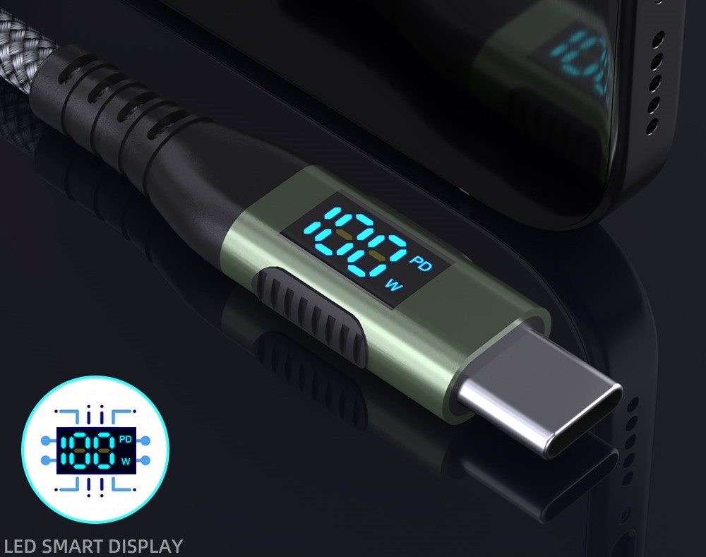Tartós, szürke USB-C kábel kijelzővel, 1 m hosszú és támogatja a 100 W-os gyorstöltést a maximális teljesítmény érdekében.