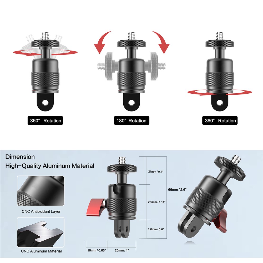 A kompakt kialakítás és a precíz megmunkálás biztosítja a kamera stabil rögzítését holtjáték nélkül. Az adapter alkalmas mindennapi használatra és igényesebb outdoor tevékenységekhez is, ahol fontos a megbízhatóság és a felvételi szög rugalmas beállítása.