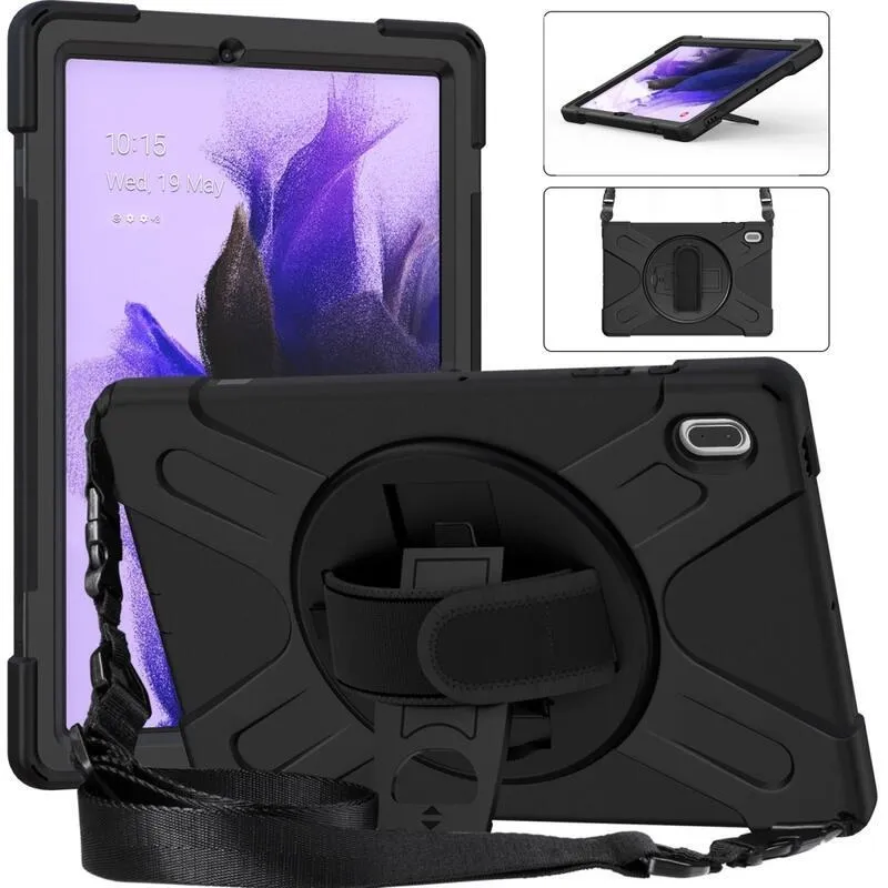 360 Tartós hibrid borítás szíjjal és kéztartóval Samsung Galaxy Tab S7 FE T736-hoz - Fekete