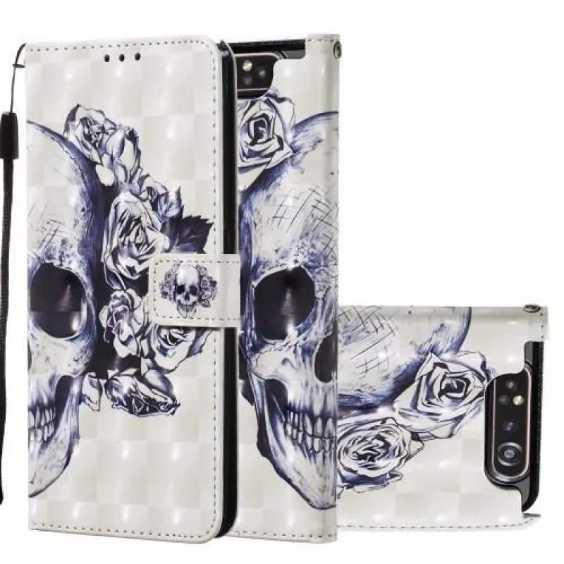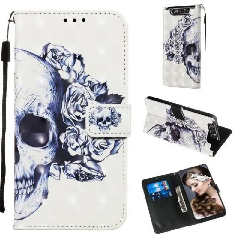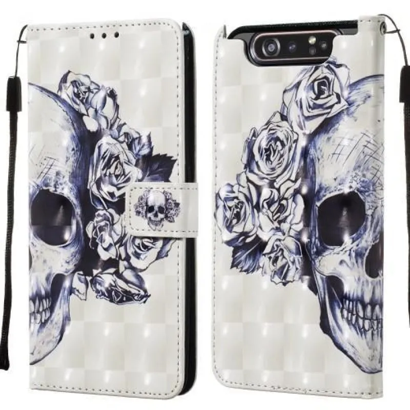 3D festés PU bőr tok Samsung Galaxy A80-hoz - koponya és virágok