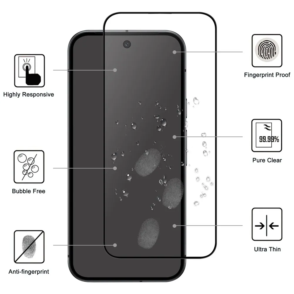 A Google Pixel 10 Pro XL teljes előlapját teljes felületű edzett üveg borítja, és megvédi a szennyeződésektől, karcolásoktól, víztől és ütésektől. A teljes felületén ragasztóréteg található, így tökéletesen tapad. A 9H keménységnek köszönhetően többszörösen hatékonyabb, mint a védőfóliák, de semmilyen módon nem befolyásolja a kijelző vezérlését vagy láthatóságát. Előnyök A Google Pixel 10 Pro XL kijelzője nem törik olyan könnyen, és egyáltalán nem karcolódik vagy maszatolódik.