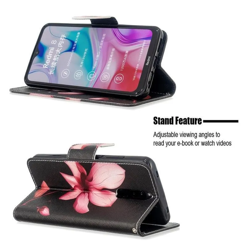 Állvány PU bőr pénztárca tok Xiaomi Redmi 8-hoz - rózsaszín virág