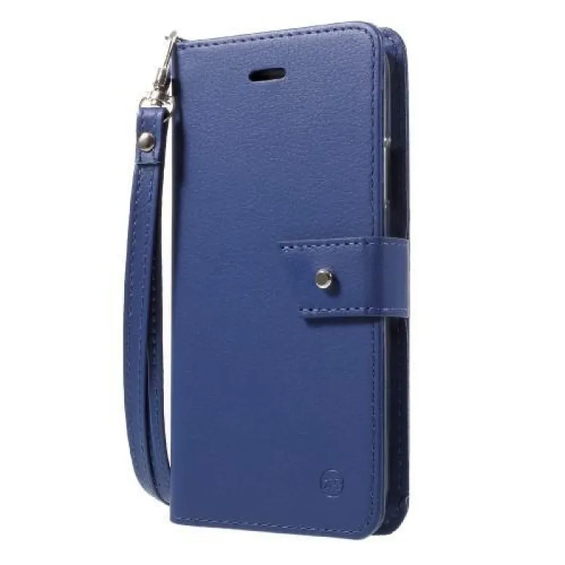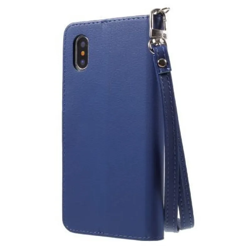 Gyönyörű sötétkék pénztárca tok iPhone X készülékhez, ugyanolyan színű kézi pánttal