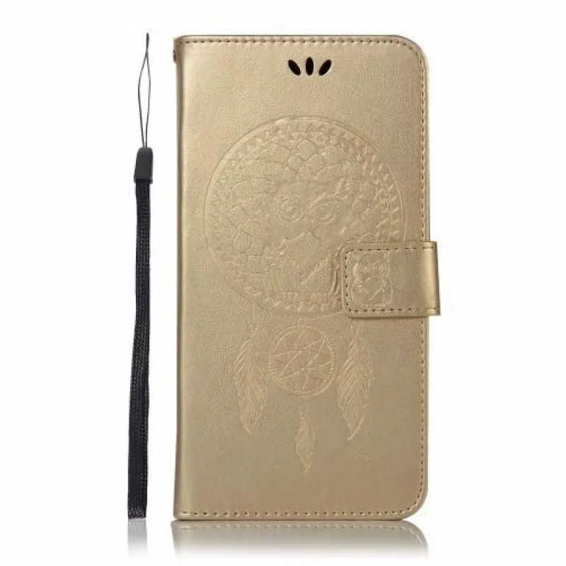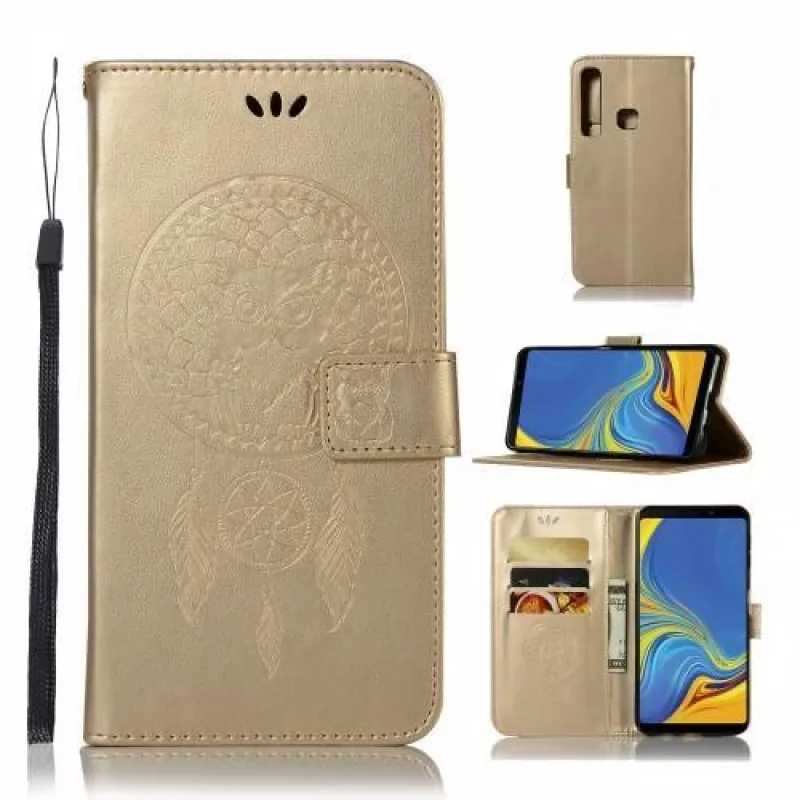 Eredeti PU bőr tok bagoly motívummal álomfogóban Samsung Galaxy A9 készülékhez - arany színben