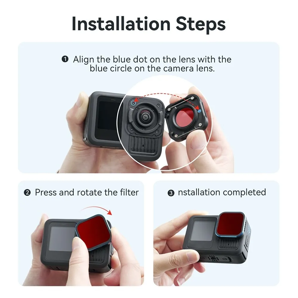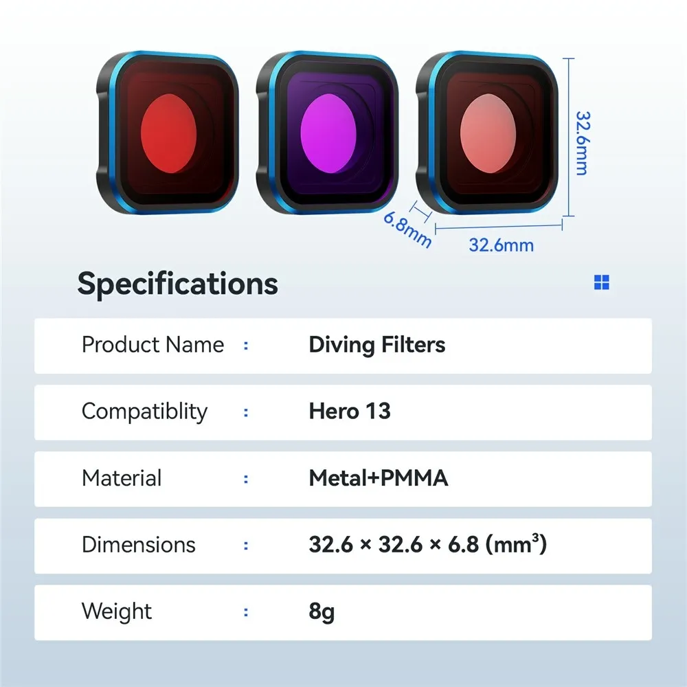 A szűrő kompatibilis a GoPro Hero 13, 12, 11, 11 Mini, 10 és 9 modellekkel, és ideális kiegészítő a víz alatti felvételek minőségének javításához rekreációs és sportbúvárkodás során.