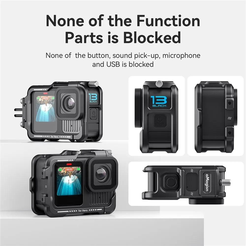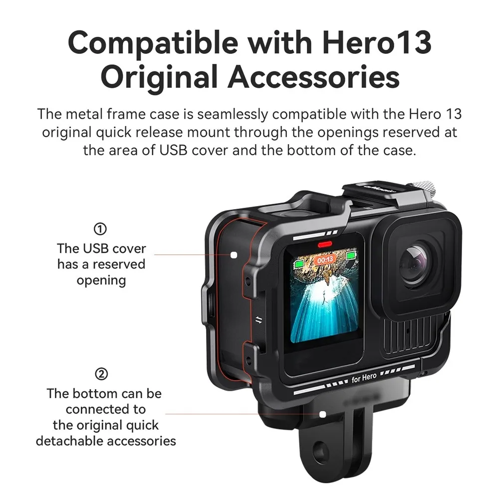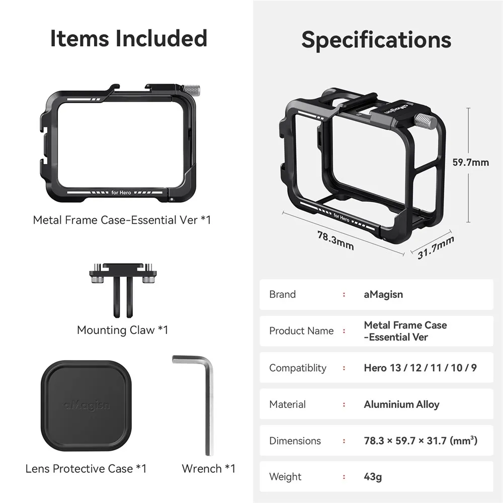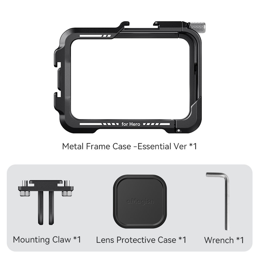 AMAGISN fém védőkeret GoPro Hero 13, 12, 11, 10 és 9 kamerákhoz készült, és fokozott védelmet biztosít nehéz körülmények közötti használat során. A masszív fém kialakítás védi a kamera házát az ütésektől, leejtéstől és mechanikai sérülésektől kerékpározás, sportolás vagy szabadtéri tevékenységek közben. A precíz kialakítás stabil illeszkedést biztosít, miközben teljes hozzáférést nyújt a gombokhoz, kijelzőhöz, csatlakozókhoz és az objektívhez.