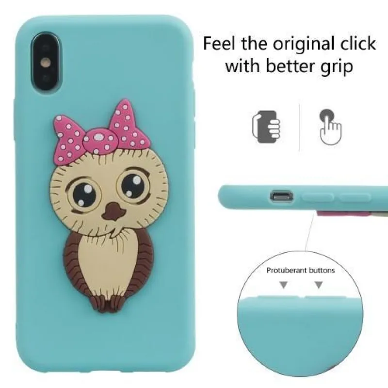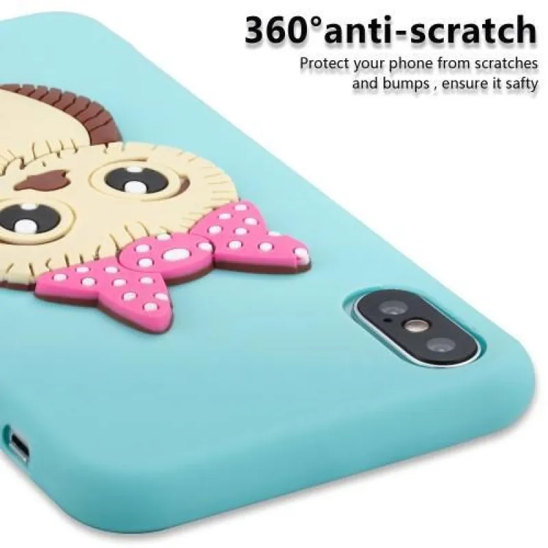 Vidám zselés tok iPhone X készülékhez világoskék színben, baglyot ábrázoló masnis képpel