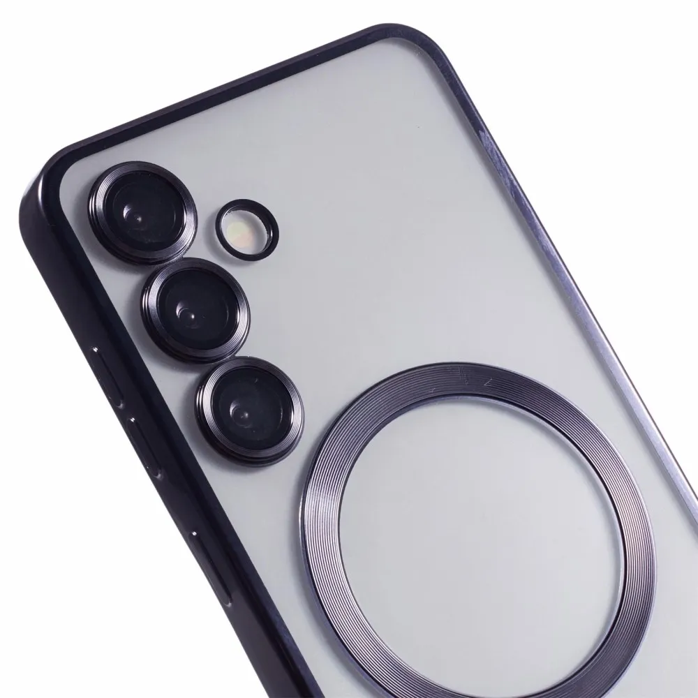 Fekete átlátszó borítás kameravédelemmel és MagSafe támogatással Samsung Galaxy S25+ készülékhez