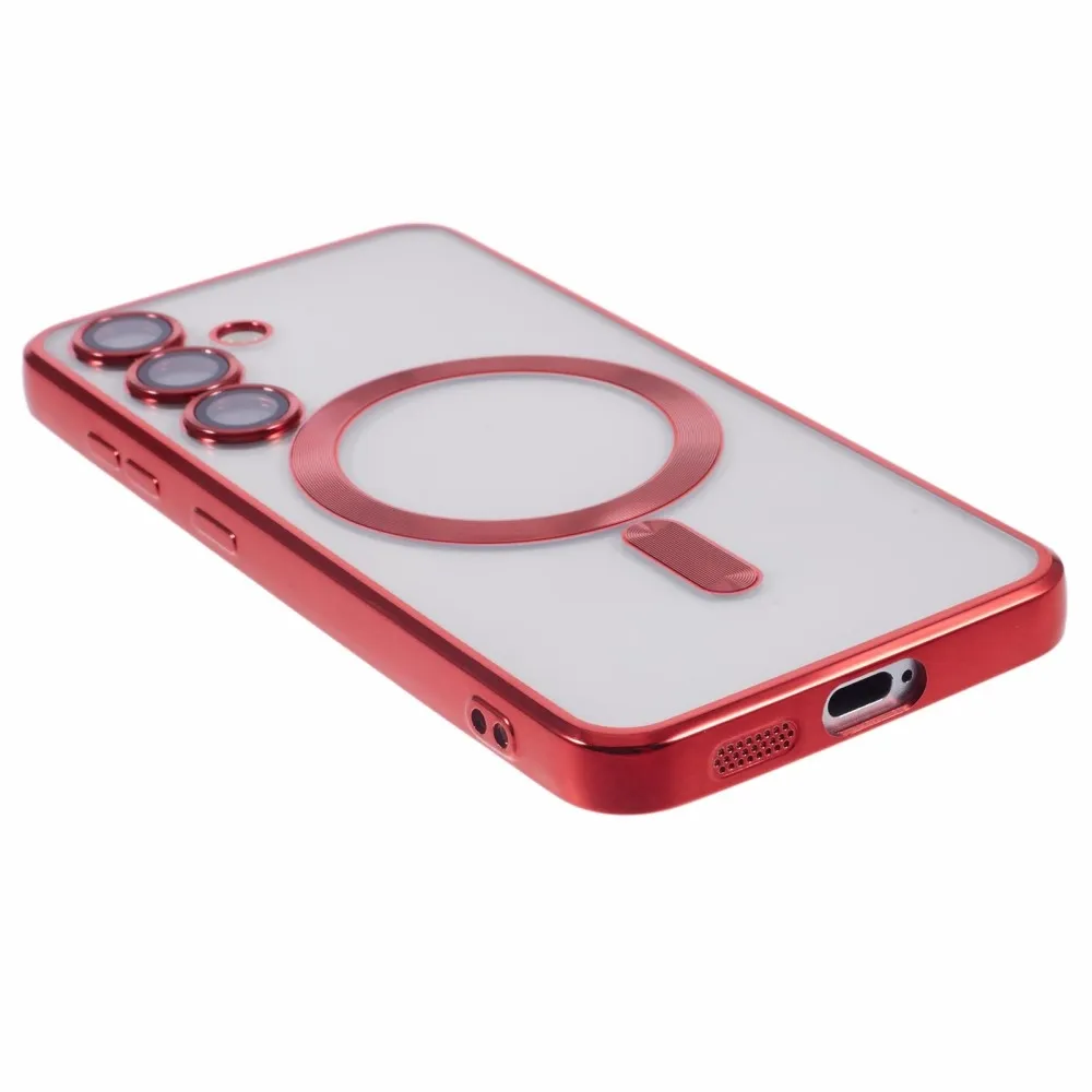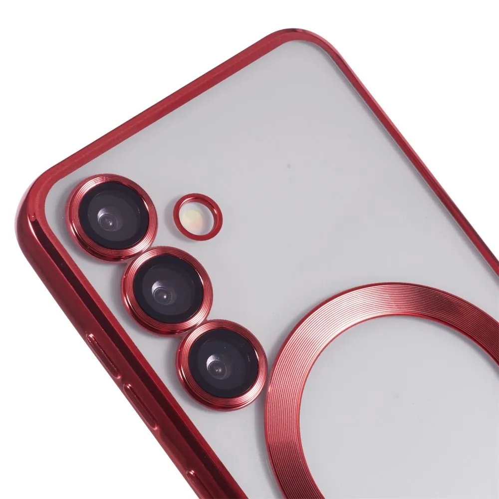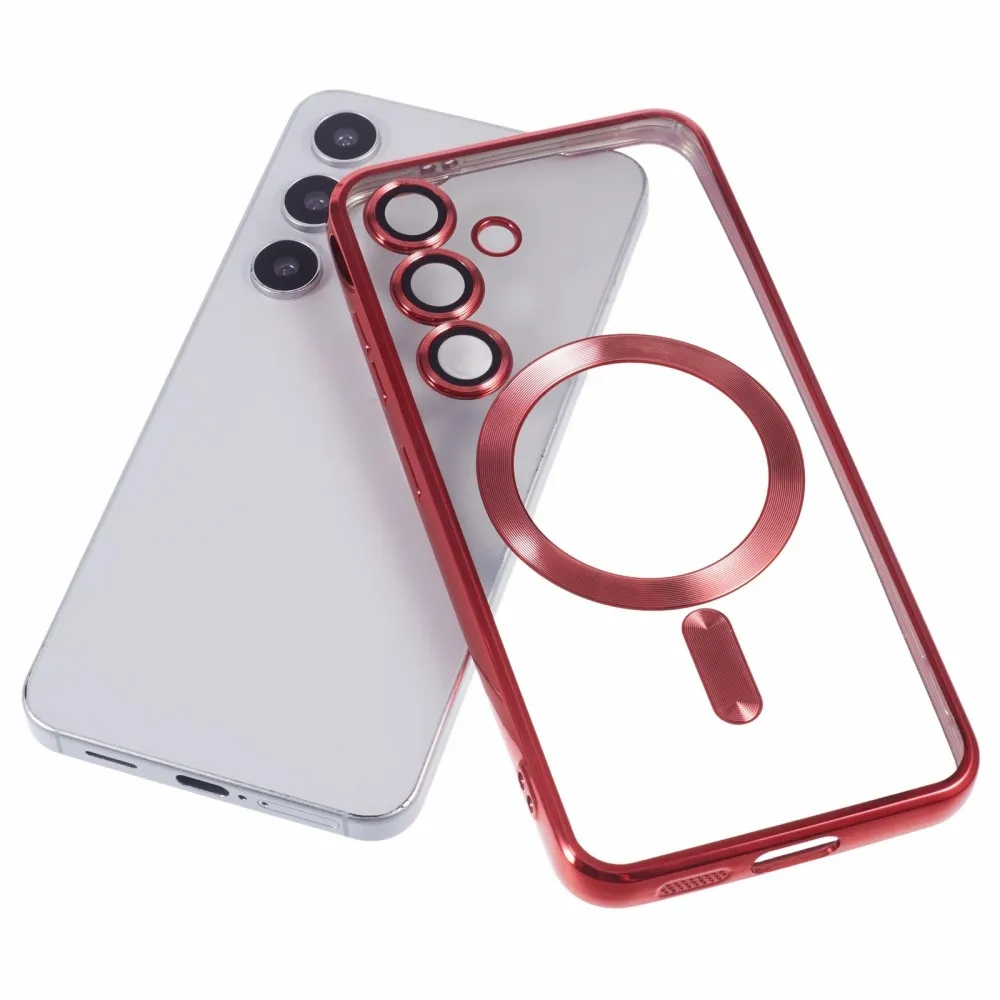 Piros átlátszó borítás kameravédelemmel és MagSafe támogatással Samsung Galaxy S25+ készülékhez