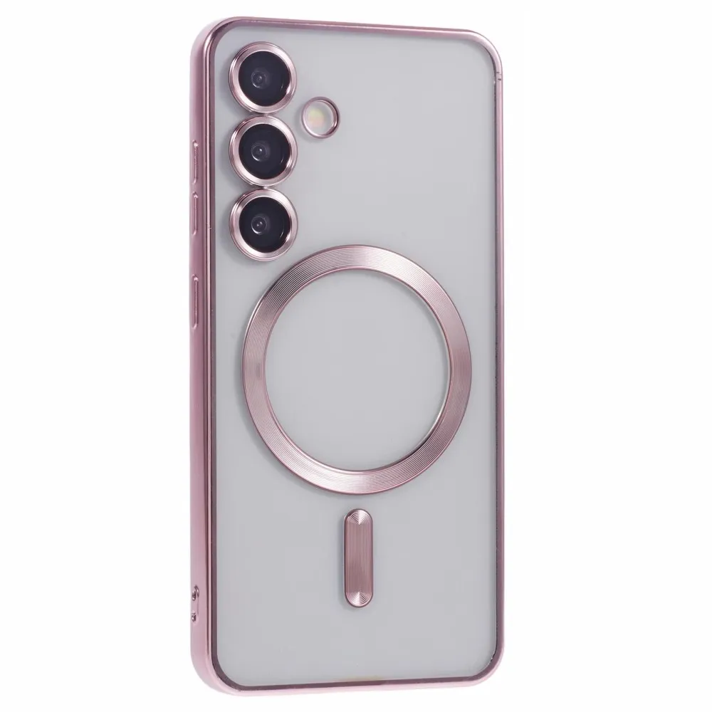 Rózsaszín átlátszó tok kamera lencsevédelemmel és MagSafe támogatással Samsung Galaxy S25 készülékhez