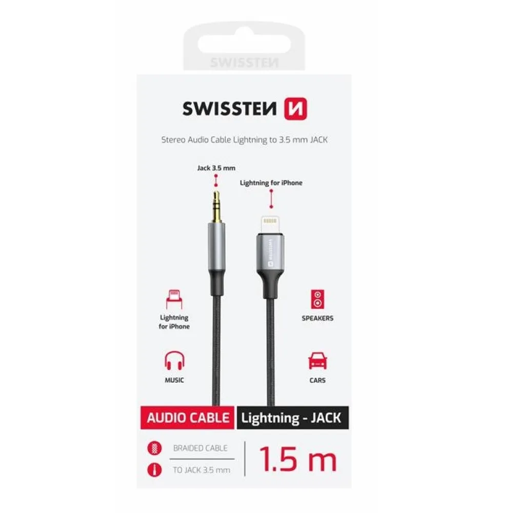 Audiokábel Swissten textil Lightning (férfi) / JACK (férfi) 1,5 m - fekete/szürke