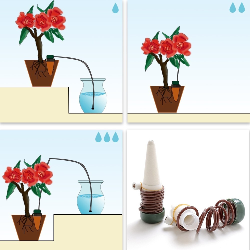 Az öntözőcsapok ideálisak szobanövényekhez, fűszernövényekhez és balkonládákhoz. Különösen hasznosak nyaralás idején vagy rendszertelen öntözés esetén. Egyszerűen töltse meg a palackot vízzel, csatlakoztassa a csövet, majd helyezze a csapot a földbe. Az öntözés fokozatosan és egyenletesen történik.