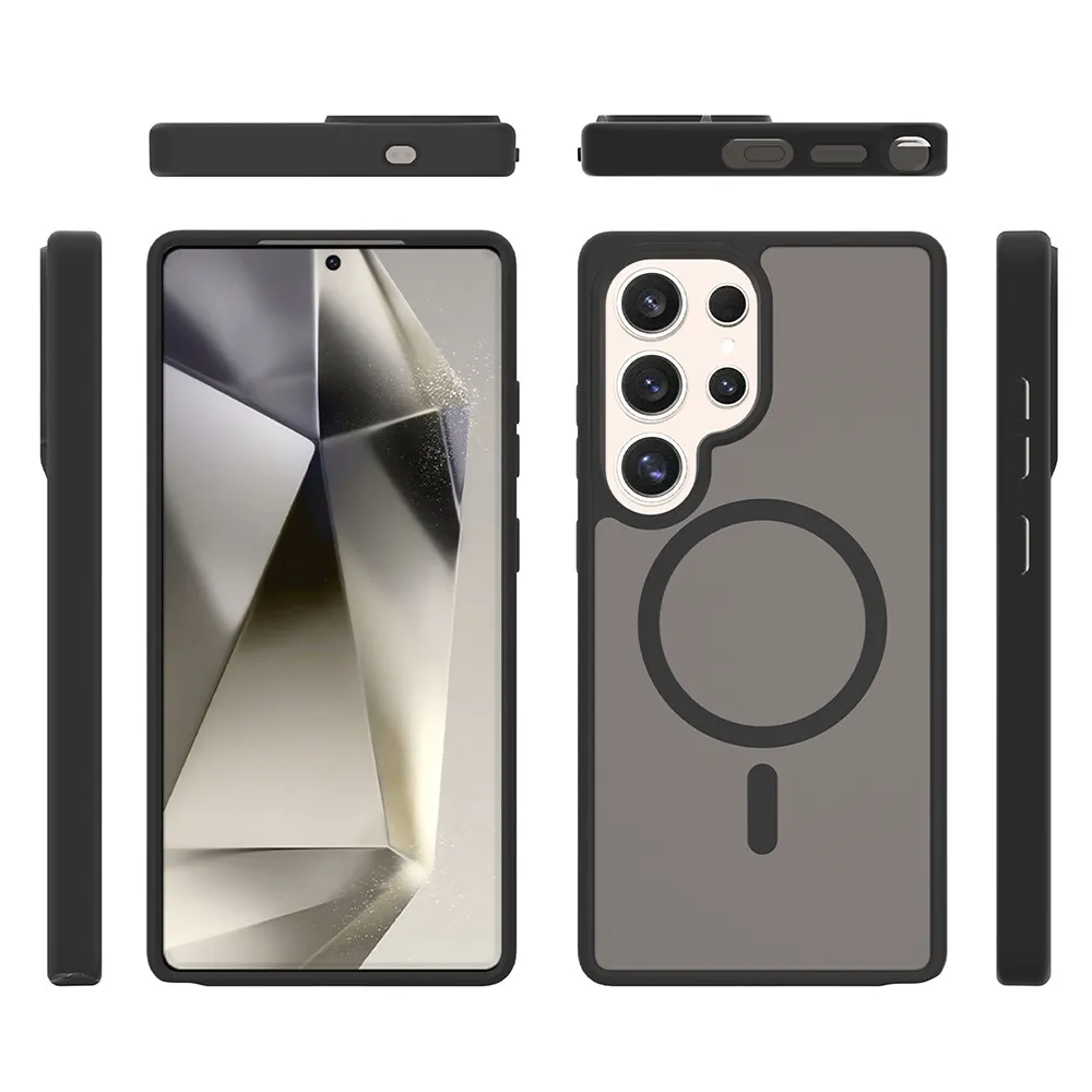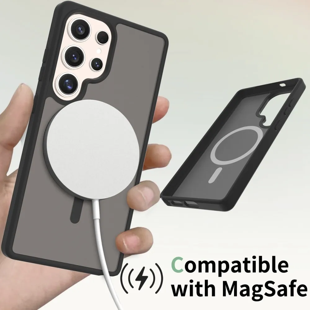 ✅【TPU keret és akril hátlap】Skin Gel kemény hátlap MagSafe támogatással Samsung Galaxy S25 Ultra készülékhez, fekete színben. Rugalmas TPU kerettel, ütéscsillapítással és biztonságos illeszkedéssel, míg a 2,0 mm vastag akril hátlap tartósságot és ellenállást biztosít. ✅【MagSafe kompatibilitás】 Beépített mágnes, amely teljes mértékben kompatibilis a MagSafe kiegészítőkkel, lehetővé téve a töltők, pénztárcák, vezeték nélküli töltés stb. egyszerű mágneses rögzítését.