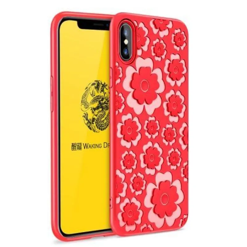 Piros szilikonborítás 3D-s virágokkal az iPhone X készüléken
