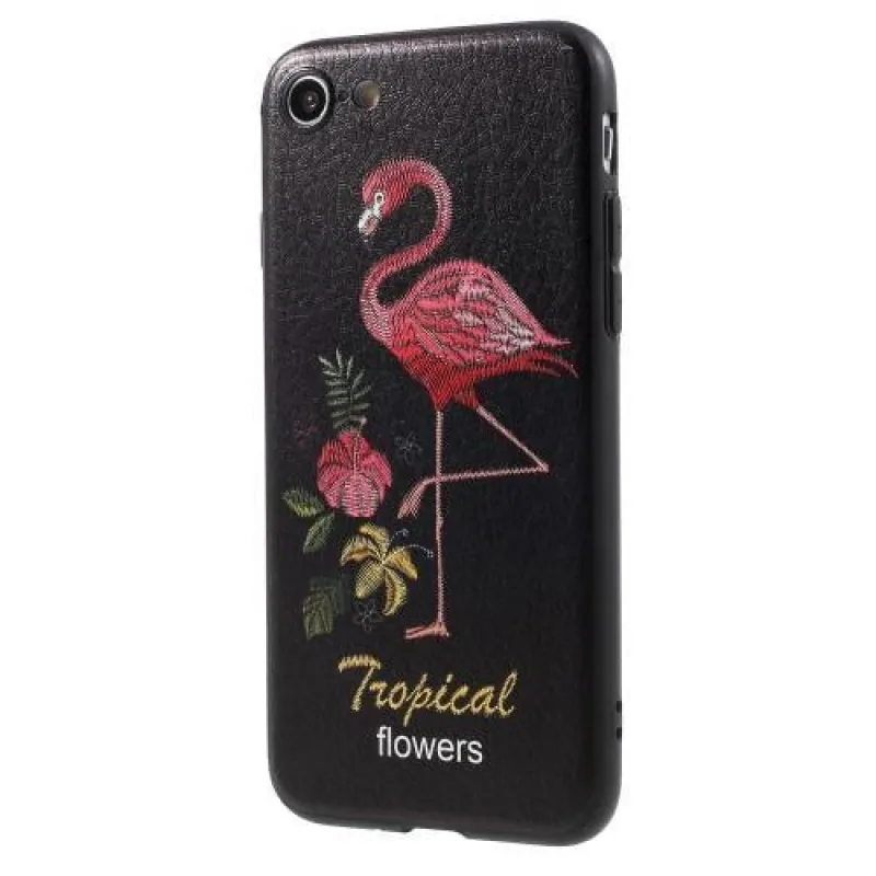 Hímzett hátsó műbőr tok zselés bevonattal iPhone 8 és iPhone 7 készülékhez, fekete színben, flamingó motívummal