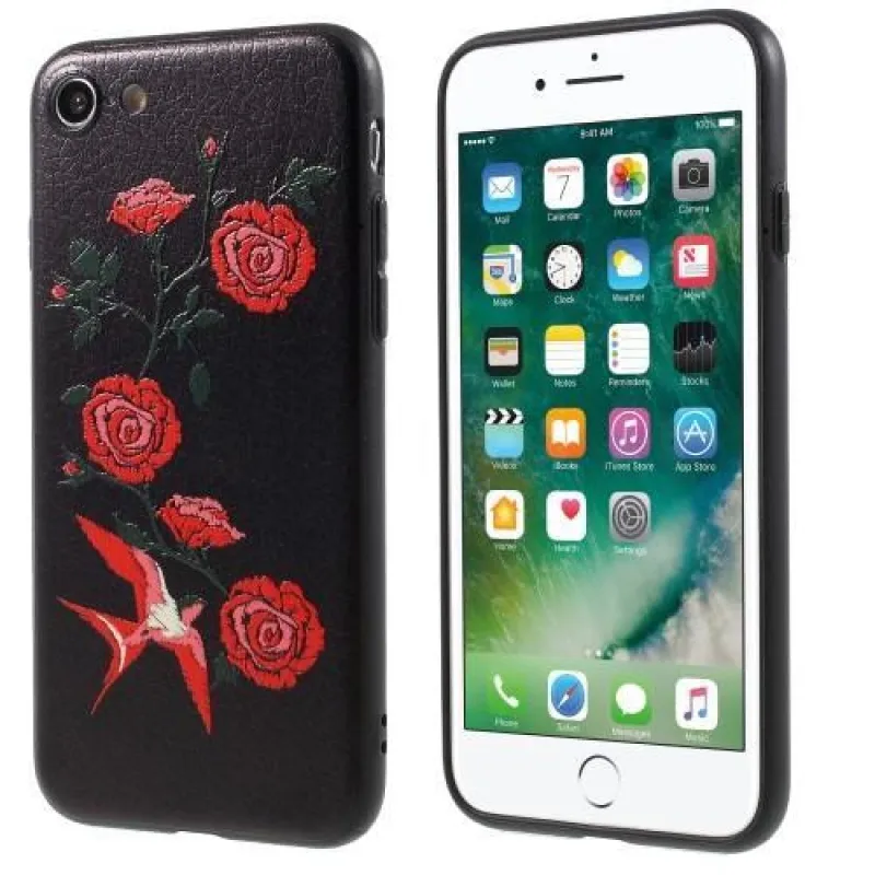 Hímzett hátsó műbőr tok zselés bevonattal iPhone 8 és iPhone 7 készülékhez, fekete színben, rózsás madár motívumokkal