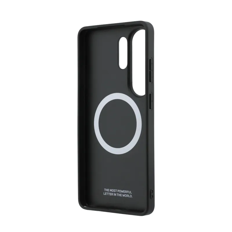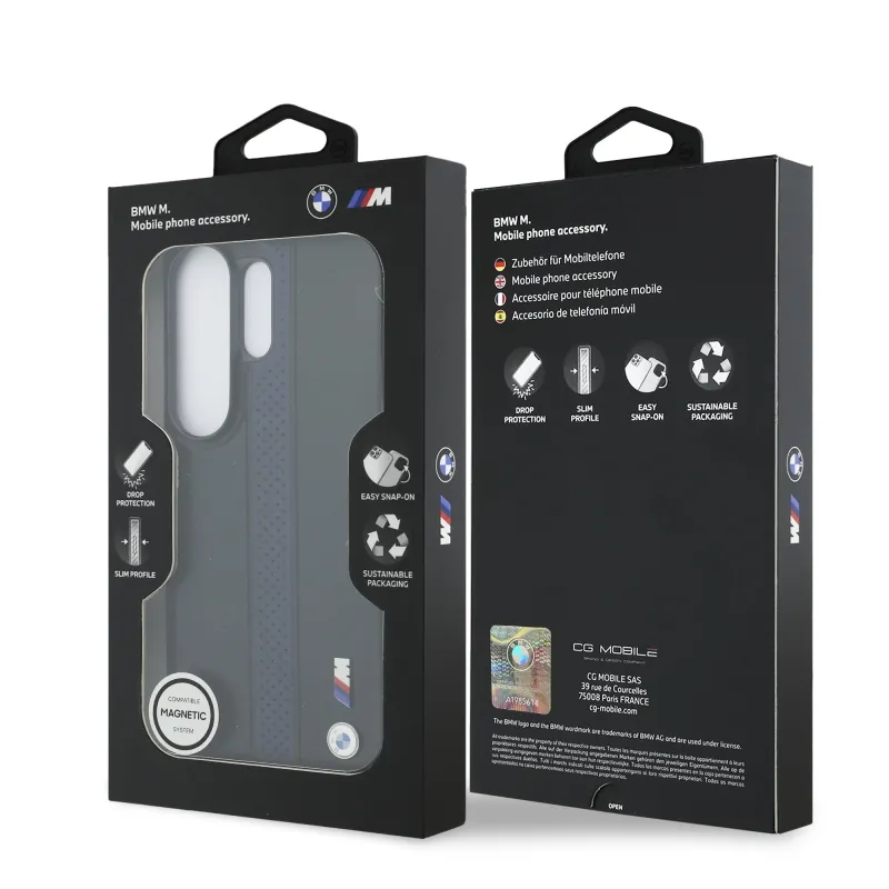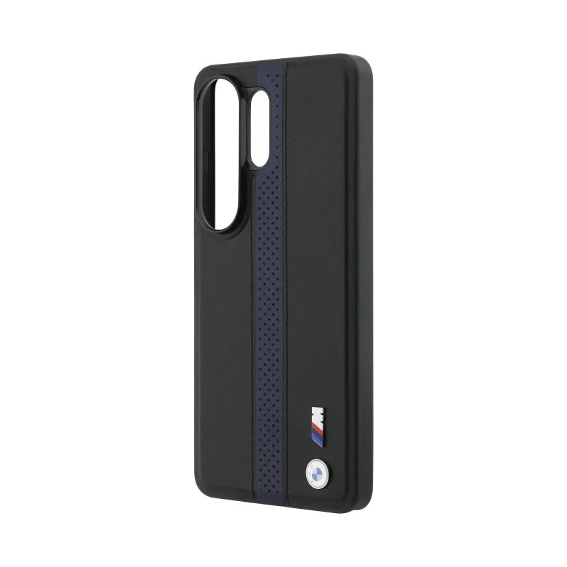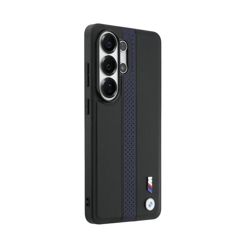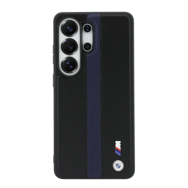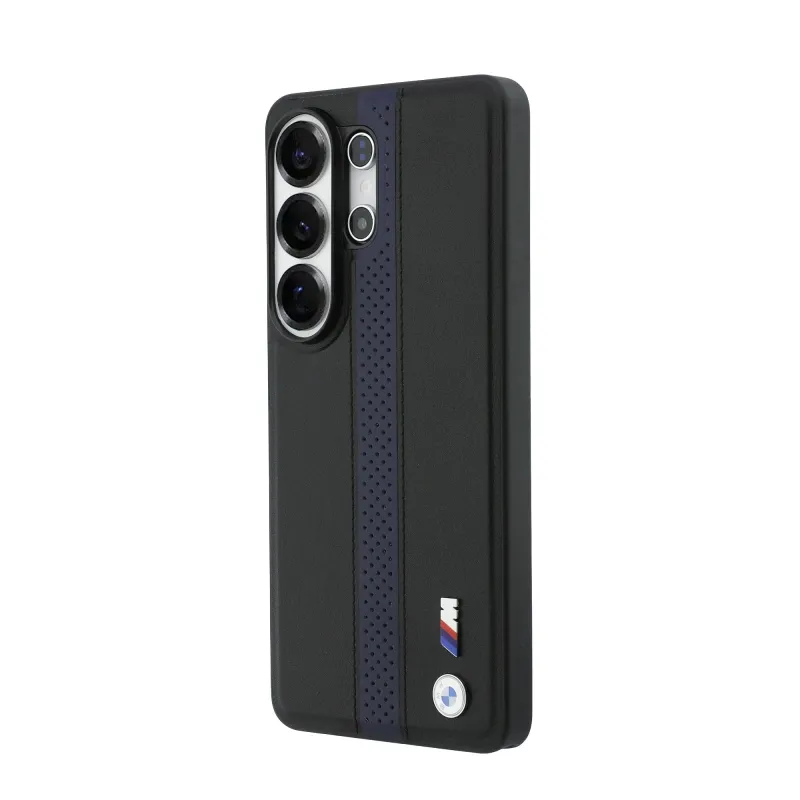 BMW M PU bőr perforált csíkok és fém logó mágneses hátlap Samsung Galaxy S26 Ultra Blue számára