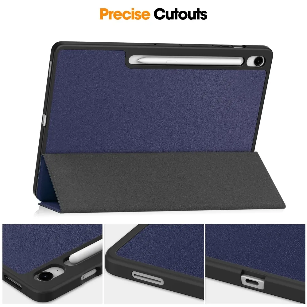 ✅【Anyag】A Casy Samsung Galaxy Tab S10 FE+ flip tok sötétkék színben puha PU bőrből készült, TPU belső tokkal kombinálva, amely kiváló minőséget és vonzó megjelenést kínál.