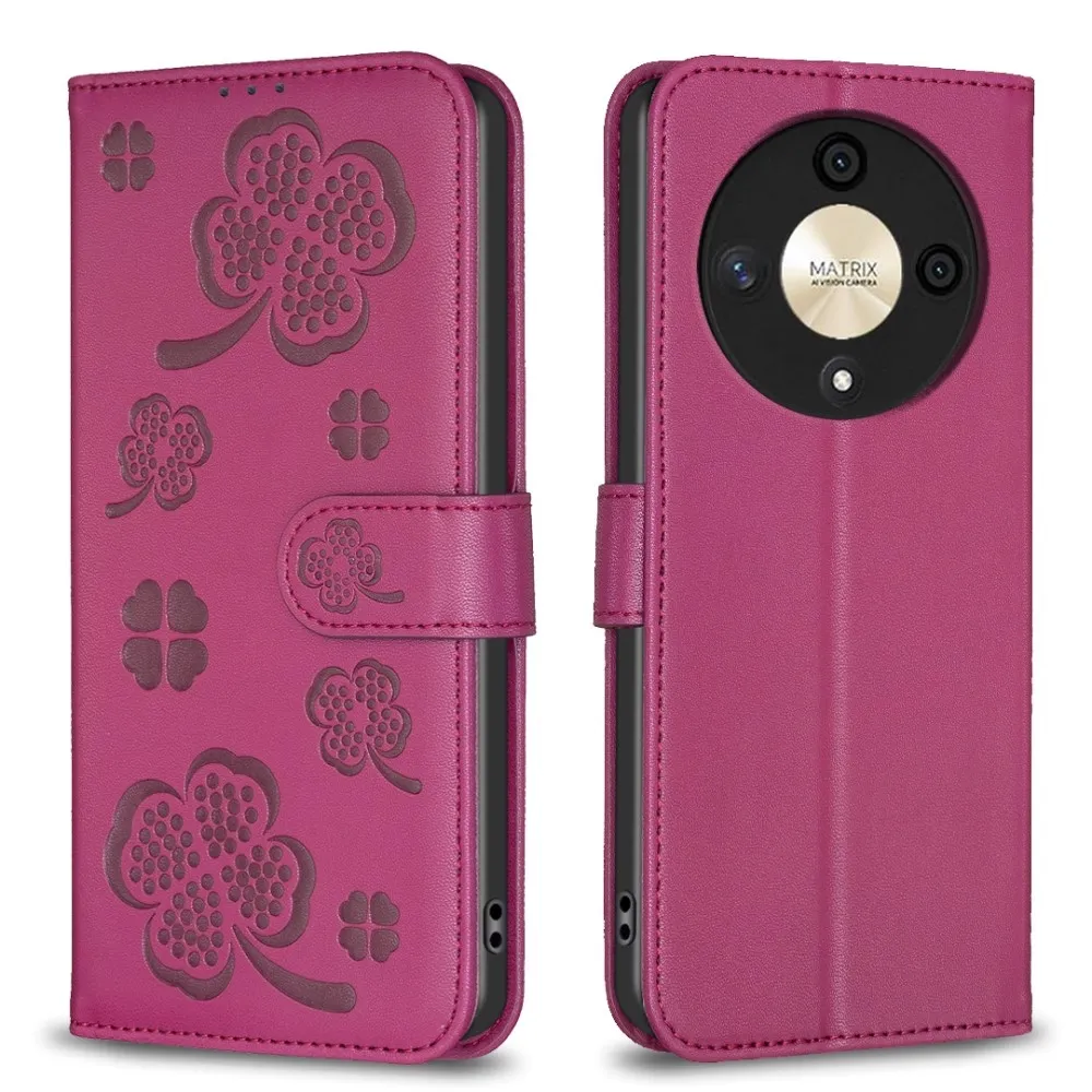 ✅【Tartós ütéscsillapítás】Clover Book tok Honor Magic 6 Lite 5G-hez - rózsaszín sima műbőrből és puha TPU anyagból készült, kiváló ütéscsillapítást és ütésvédelmet biztosítva, megvédve telefonját a mindennapi ütődésektől