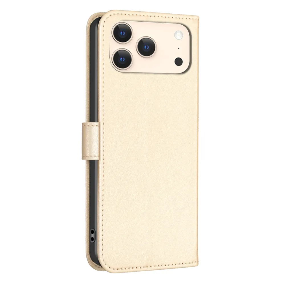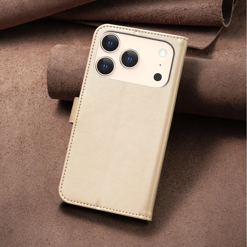 ✅【Tartós ütéscsillapítás】A Clover Book tok iPhone 17 Pro Max-hez - Arany színű, sima műbőrből és puha TPU anyagból készült, kiváló ütéscsillapítást és ütésvédelmet biztosítva, megvédve telefonját a mindennapi ütődésektől.