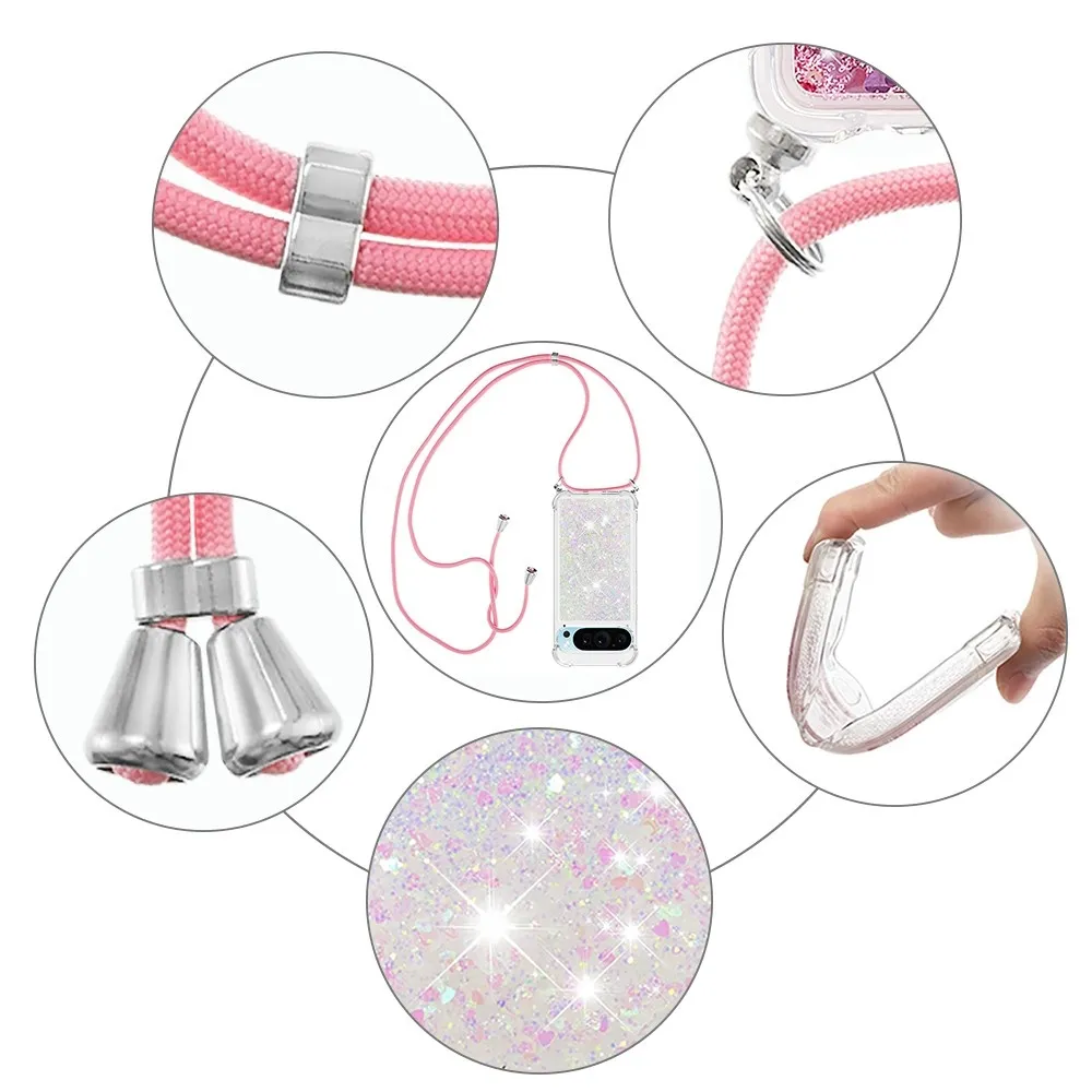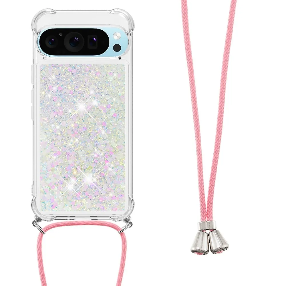 Rózsaszín és ezüst szívecskékkel Csillogó homokóra zselés borítás zsinórral a Google Pixel 10 Pro/Pixel 10 készülékhez