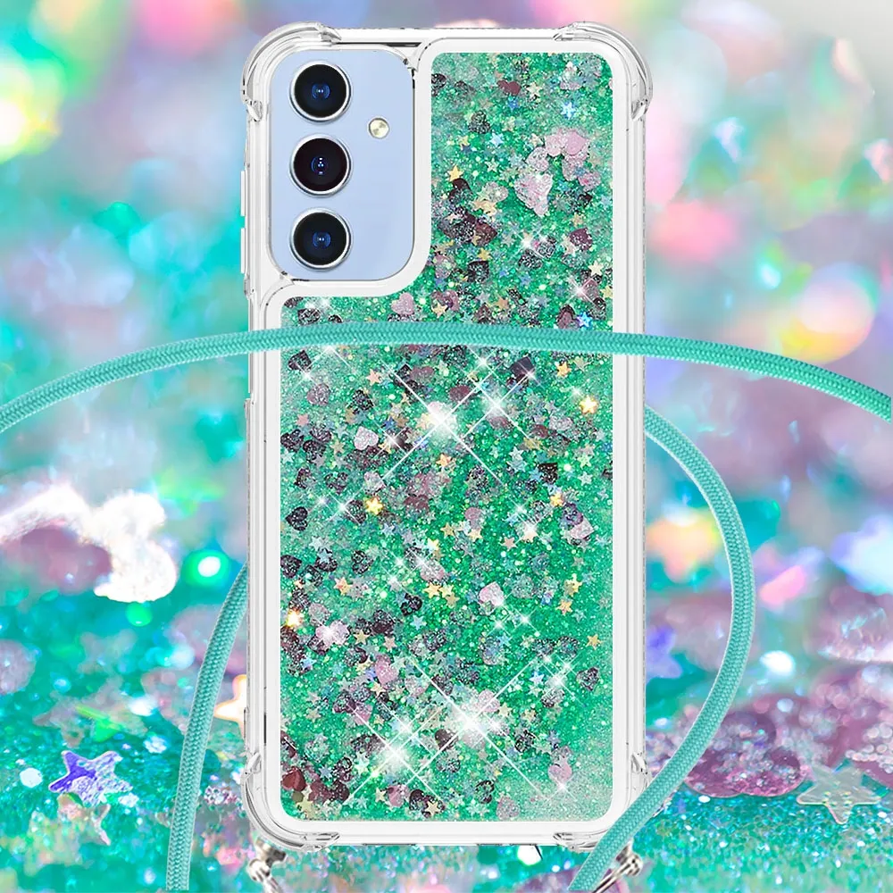 ✅【Fokozott ütésvédelem】A Samsung Galaxy A17 4G/5G Glitters Lanyard tokját körülvevő puha TPU perem kiváló ütésvédelmet és leejtésmegelőzést biztosít, biztosítva, hogy telefonja biztonságban legyen a véletlen ütődésektől. ✅【Homokos, csillogó dizájn】A folyadékban lévő csillogó flitterek szabadon mozognak, és lenyűgöző hatást keltenek, mint a vízben úszó csillagok, így a telefontok egyszerre szórakoztató és divatos.
