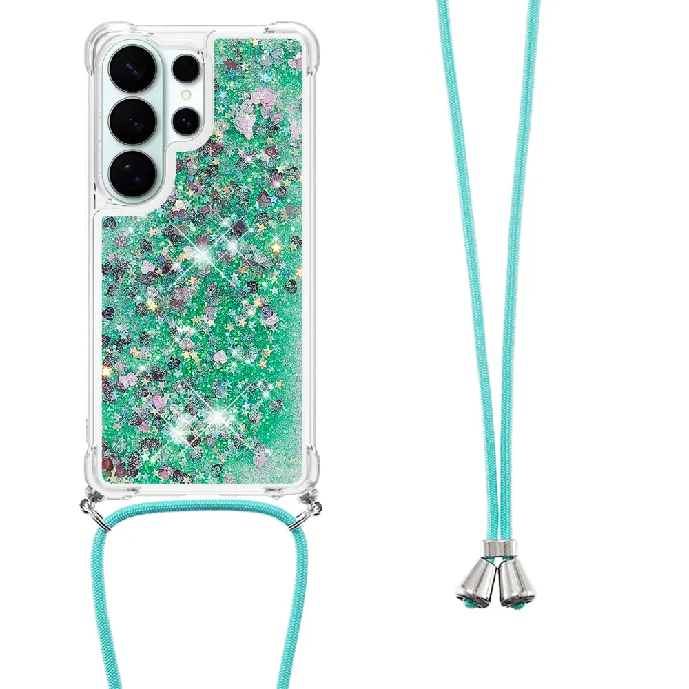 Csillogó homokóra zselés tok húzózsinórral Samsung Galaxy S26 Ultra készülékhez - zöld/szív