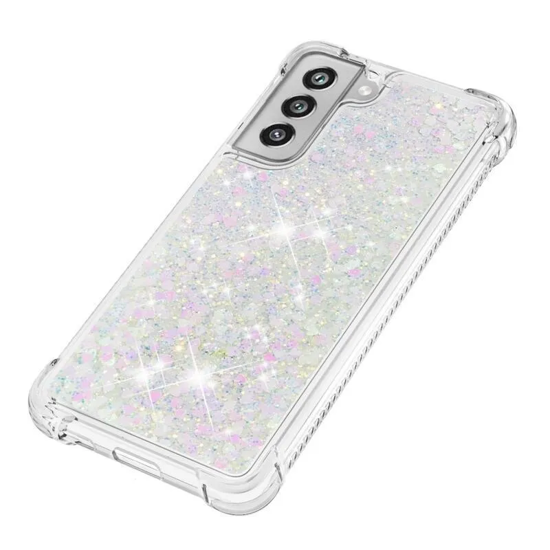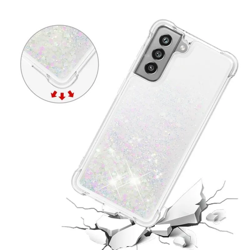 Csillogó homokóra zselés tok Samsung Galaxy S21 FE 5G - rózsaszín/ezüst/szív