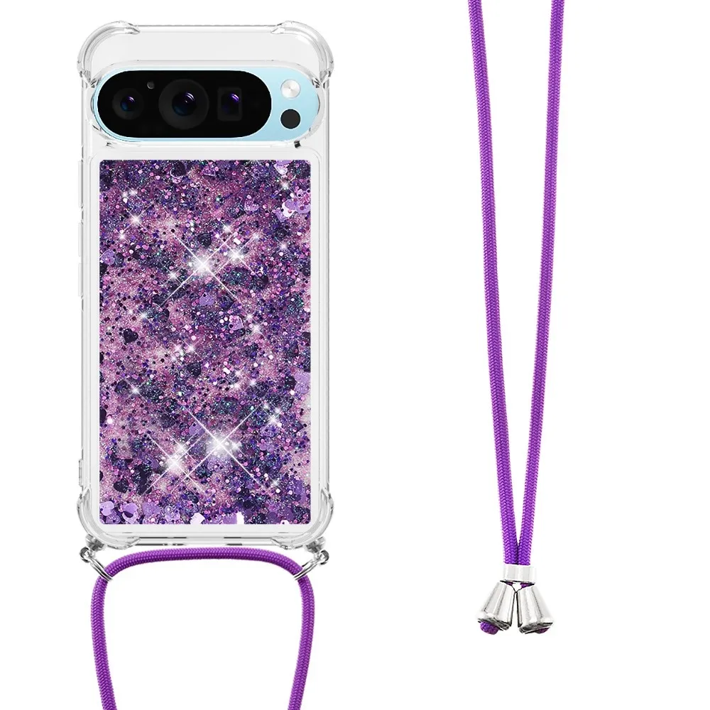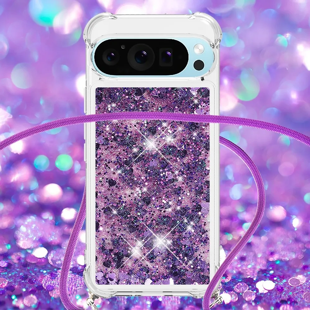 Csillogó homokóra zselés tok zsinórral a Google Pixel 10 Pro/Pixel 10 számára - sötétlila/szívecske