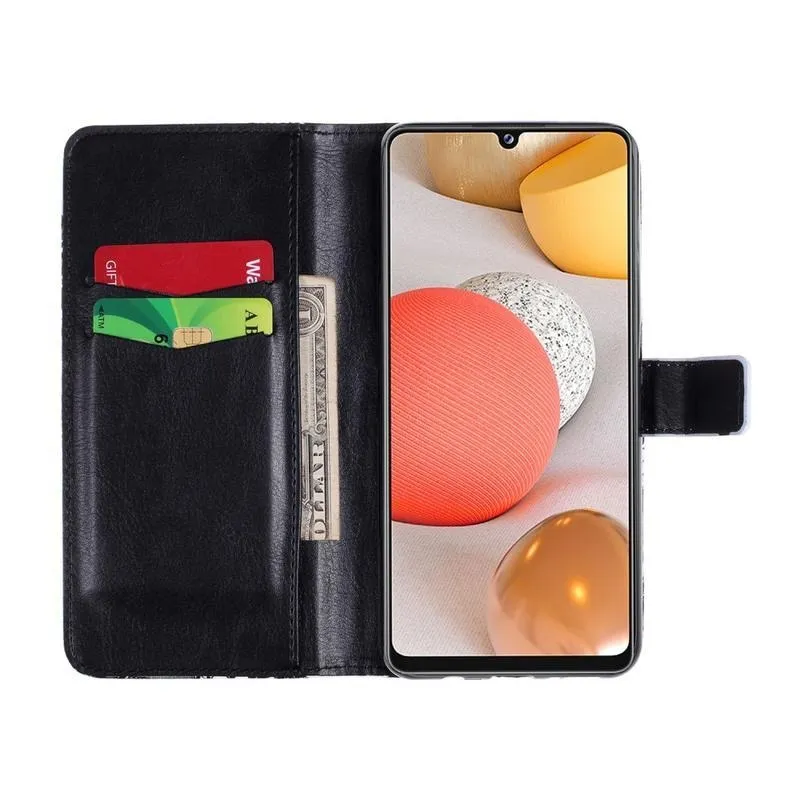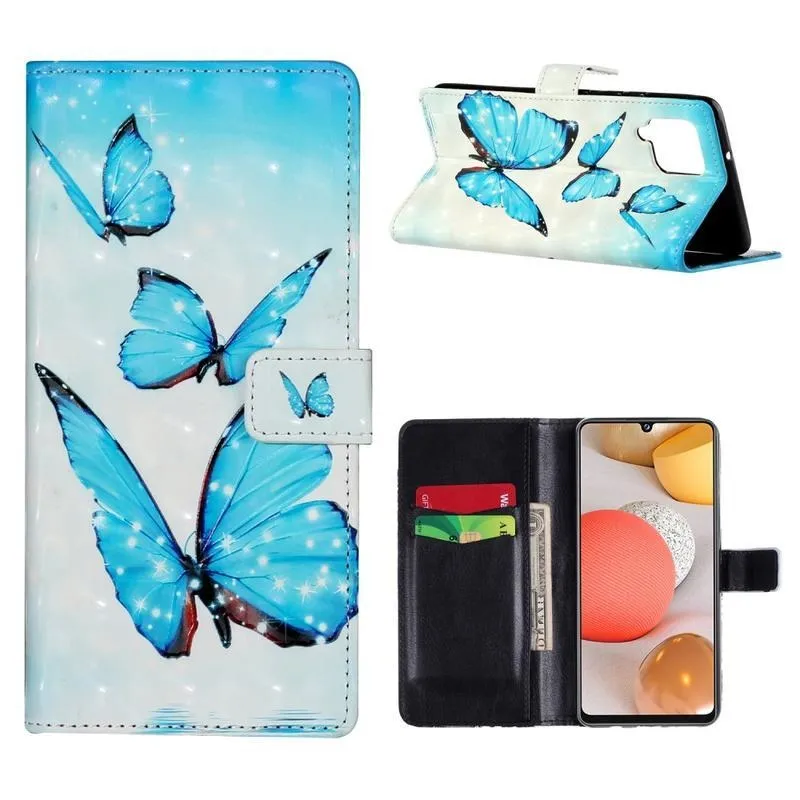 Dekor PU bőr pénztárca tok Samsung Galaxy A42 5G - kék pillangókhoz