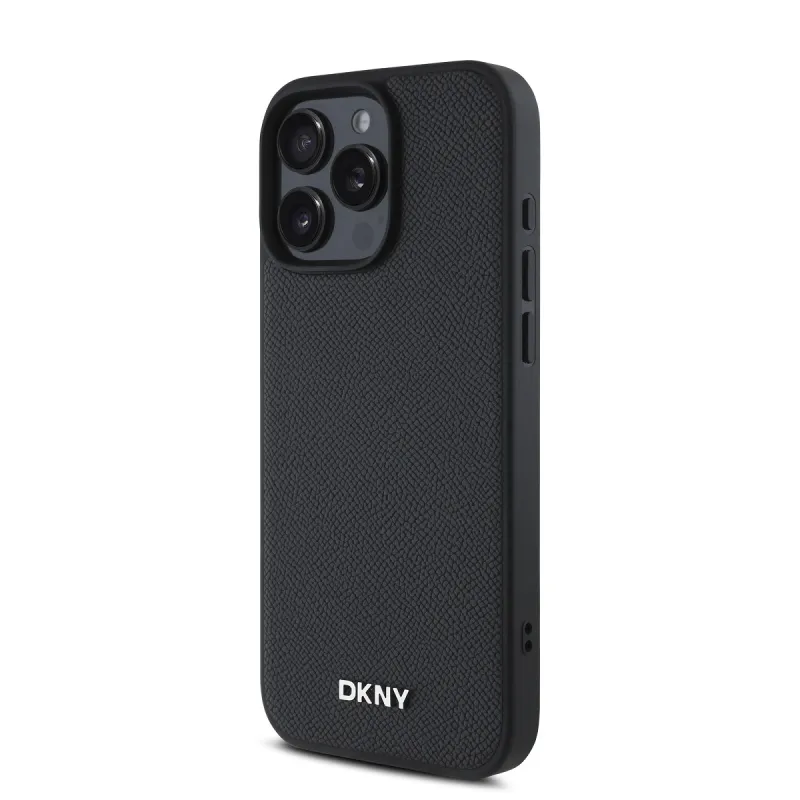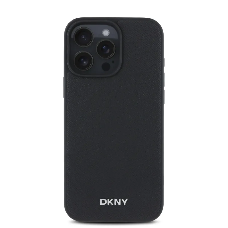 DKNY PU bőr ezüst fém logó Magsafe hátlap iPhone 16 Pro Fekete