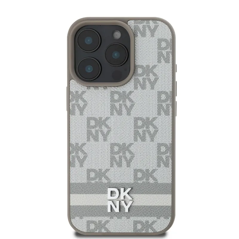DKNY PU bőr kockás mintás és csíkos hátsó borító iPhone 16 Pro bézs színű készülékhez