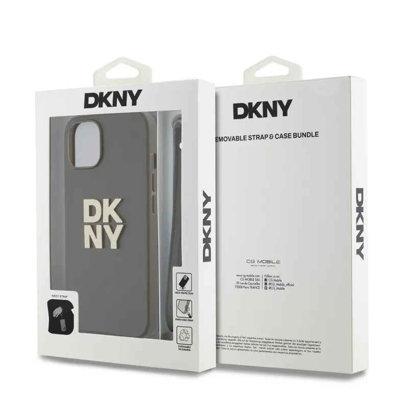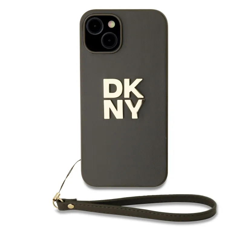 DKNY PU bőr Stack Logo csuklópánt hátlapi borító iPhone 15-hez Barna