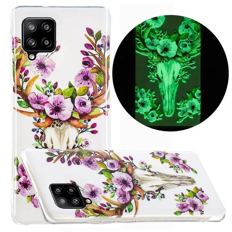 Éjjeli fényes zselés tok mobiltelefonhoz Samsung Galaxy A42 5G - virágok és koponya rénszarvasok