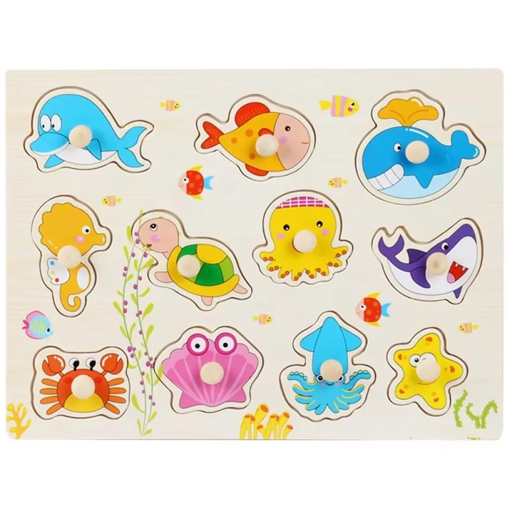 Ez a gyermekjáték a tengeri élőlények világának témájával egy fa játék korai tanuláshoz, kognitív fejlesztéshez. Különféle tengeri állatok formáit tartalmazza. Fából készült, biztonságos és tartós, mérete: 22,5 x 30 cm. 0–4 éves korú gyermekek számára alkalmas, és az interaktív játék révén támogatja a kognitív fejlődést. Játékkal támogathatja gyermekének mozgáskoordinációját, logikai gondolkodását és képzelőerejét szórakoztató módon. Ez a fa puzzle állatfigurákkal ötvözi a játékot és a tanulást, segítve a gyerekeket a körülöttük lévő világ felfedezésében. Nemcsak a játék örömét nyújtja, hanem lehetőséget ad a mozgáskoordináció gyakorlására és a beszéd fejlesztésére az állathangok utánzásán keresztül.