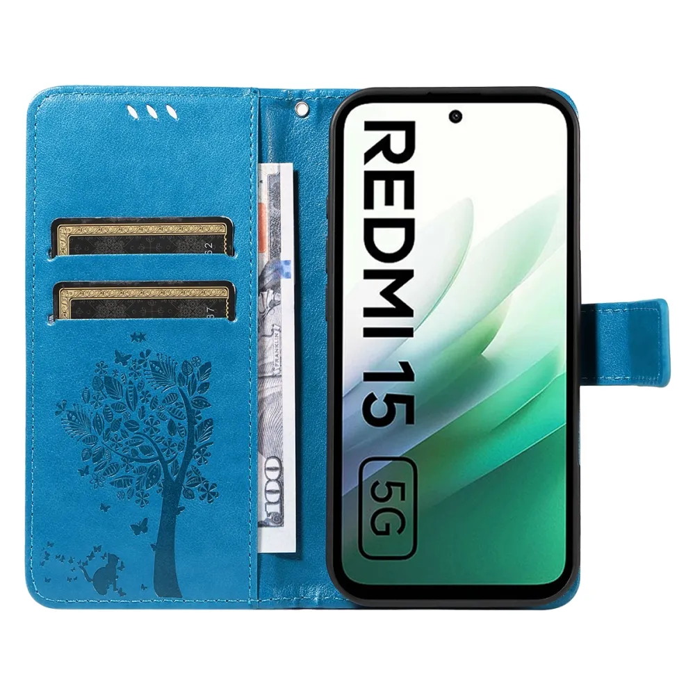 Kék pénztárca tok fák a Xiaomi Redmi 15 4G (171mm) számára