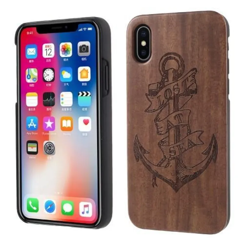Fás műanyag tok fából készült hátlappal és égetett motívummal iPhone X készülékhez - horgony