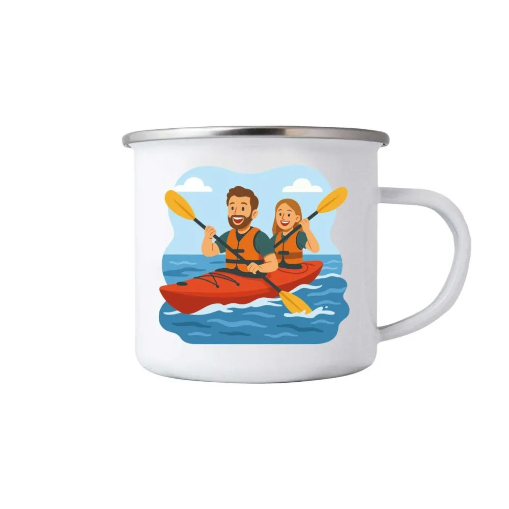 A kajakon evező párost ábrázoló motívum az örömöt, az összhangot és a vízparti pillanatok könnyedségét idézi. Az illusztráció tele van energiával és nyári hangulattal, ahol minden evezés egy apró kaland. Ez a bögre felidézi a nyugodt folyami reggeleket, a tavon töltött túrákat, és tökéletes társ mindenkinek, aki szereti a vízi sportokat vagy a természet közelségét.
