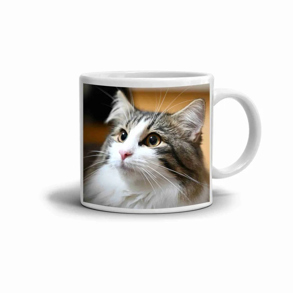 Ennél a bájos motívumnál azonnal magára vonja a figyelmet a macska kifejezése, amely egyszerre kíváncsi és gyengéd. A finom arcvonások, a puha szőr és a nagyra nyílt szemek meleg, kedves hangulatot teremtenek, így a bögre minden nap otthonosabbá válik a macskakedvelők számára.