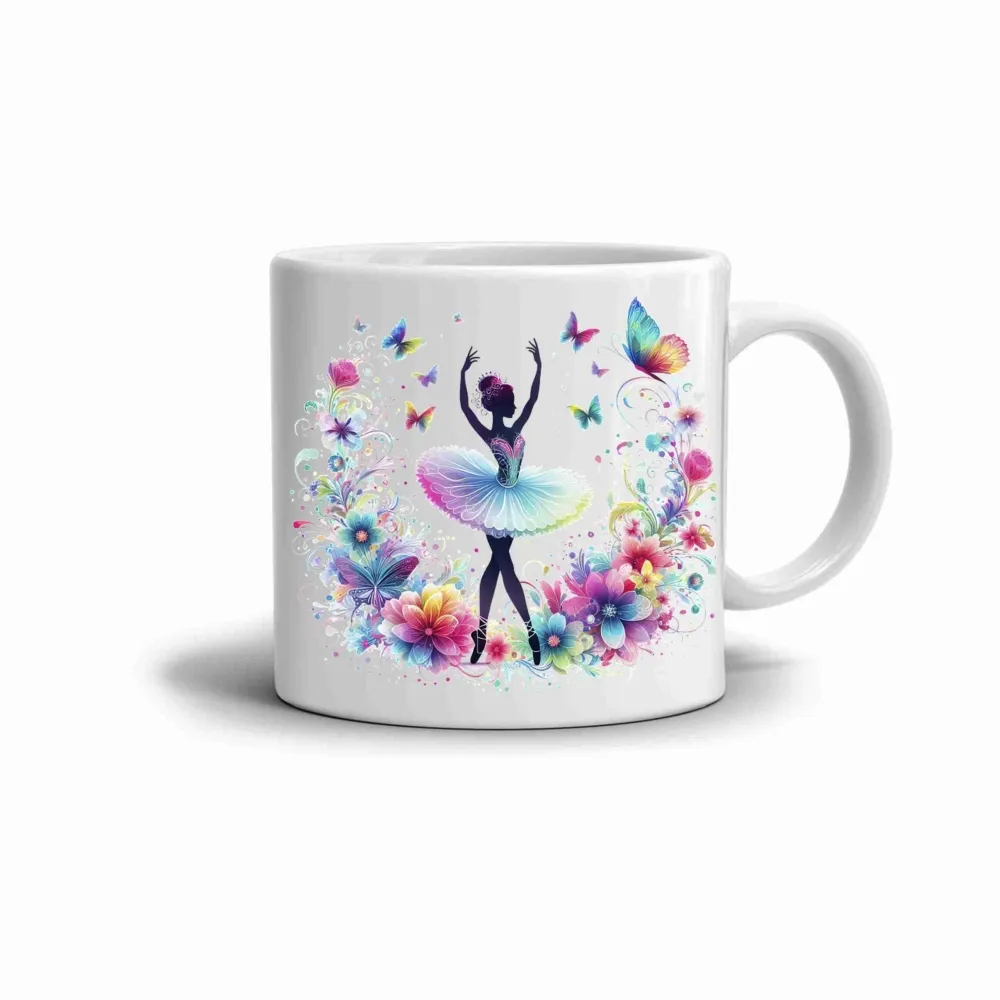 A színek és a mozdulatok finom táncát egy balerina sziluettje kelti életre, akit virágok és pillangók vesznek körül. A bögre olyan, mint egy kép, tele könnyedséggel, eleganciával és fantáziával. Az élénk árnyalatok kombinációja örömöt és szabadságérzetet sugároz, amely feldobja a mindennapokat.