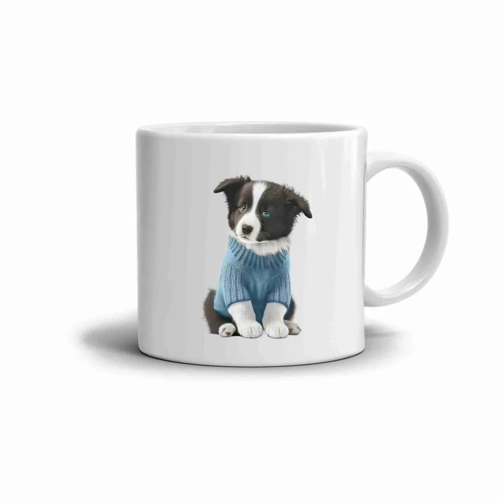A bögre motívja egy aranyos kutyust ábrázol kék pulóverben, aki barátságos és nyugodt benyomást kelt. A finom kék és fehér árnyalatok harmonikus egységet alkotnak, és kellemes, meleg hangulatot adnak a motívumnak. A kifejező szemek és a részletesen kidolgozott szőrzet élethű megjelenést biztosítanak, ami természetes bájt kölcsönöz a dizájnnak. Ez a bögre örömöt és nyugalmat visz minden kortyba.