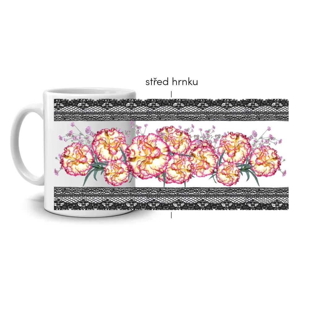 A fehér kerámia bögre finom szegfűvirág mintával, kiegészítve apró virágokkal és zöld levelekkel. A motívum fölött és alatt fekete csipke fut, elegáns dekoratív hatást kölcsönözve a bögrének.