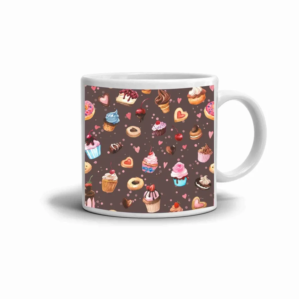 A színes mintájú bögre tele van süteményekkel, cupcake-ekkel és édességekkel, így vidám és játékos hangulatot áraszt. A motívum egy cukrászdai álmot idéz, amely feldobja a reggeleket és a kávészüneteket. A meleg barna és rózsaszín árnyalatok kellemes kontrasztot alkotnak, és édes energiát sugároznak. Ez a design minden napba egy kis derűt és jókedvet visz.