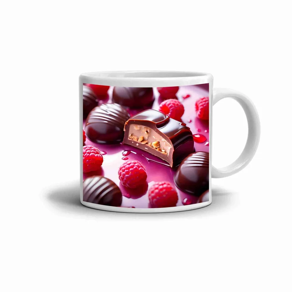 Az ínycsiklandó pralinék és a friss málna édes és vonzó motívumot alkotnak, amely az élvezetet és az örömteli pillanatokat idézi. A mély csokoládé árnyalatok kontrasztot képeznek a világospiros málnákkal, és minden napba energiát és édes hangulatot visznek. Ez a bögre ideális minden édességkedvelő számára, aki értékeli az esztétikus, szép részleteket. A motívum minden korty élvezetét örömtelivé varázsolja.