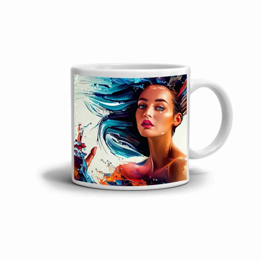A színgazdag, művészi ábrázolás egy nőt jelenít meg, akit lendületes, hullámszerű vonások vesznek körül, mintha víz és fény energiája ölelné körbe. A kék, narancs és rózsaszín árnyalatok kiemelik arcának kifejező vonásait, és modern, életteli hangulatot adnak az egész jelenetnek. A kompozíció az elegancia, az erő és a kreatív energia harmonikus összhatásaként hat, amely azonnal megragadja a tekintetet.