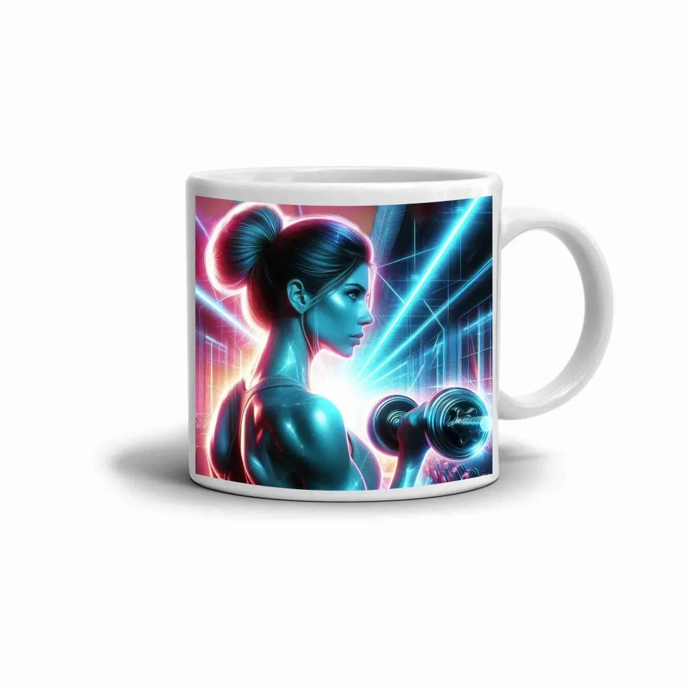 A bögrén egy sportos nő súlyzóval látható, amely modern, energikus és magabiztos hatást kelt. Az élénk színek és a fényhatások mozgást és koncentrációt sugallnak. A motívum ideális választás mindenkinek, aki kedveli az edzést, a fitneszt vagy az aktív életmódot.