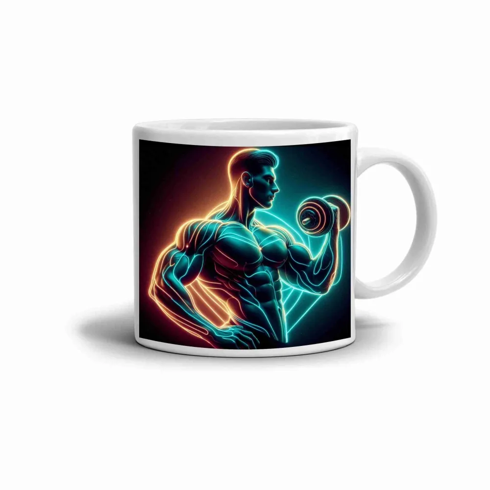 A bögrén látható súlyzóval edző férfi modern, neonfényes stílusban jelenik meg. Az élénk színek és a dinamikus fényvonalak az erőt, az összpontosítást és a fizikai teljesítményt hangsúlyozzák. A dizájn elsősorban a fitnesz, az edzés és az aktív életmód kedvelőinek szól.