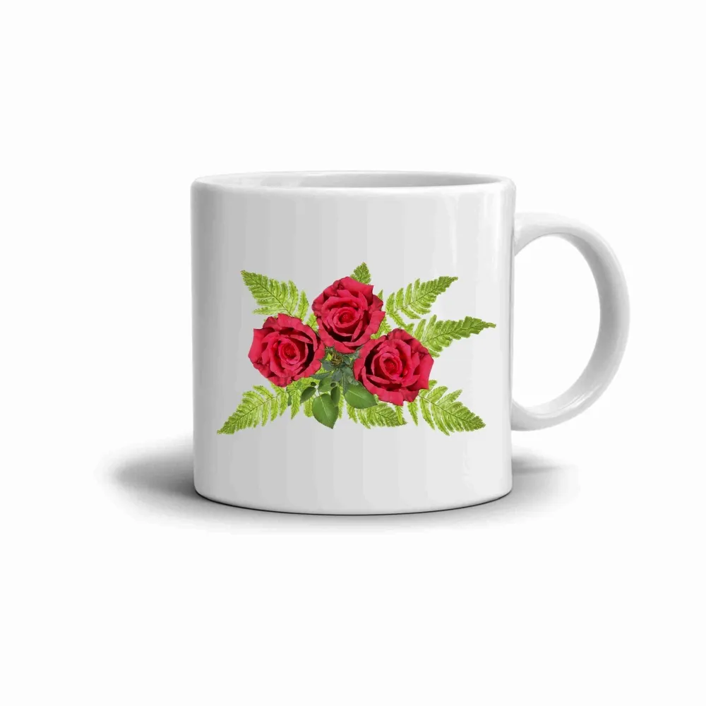Az elegáns motív három vörös rózsával és finom zöld levelekkel minden korty italhoz örömet, szépséget és harmóniát ad. A virágok élénk színei kontrasztot alkotnak a bögre fehér hátterével, így finom és kifinomult motívumot hoznak létre, amely esztétikus és harmonikus hatású. Ez a bögre ideális mindazok számára, akik szeretik a virágokat és az elegáns, kiegyensúlyozott mintákat.