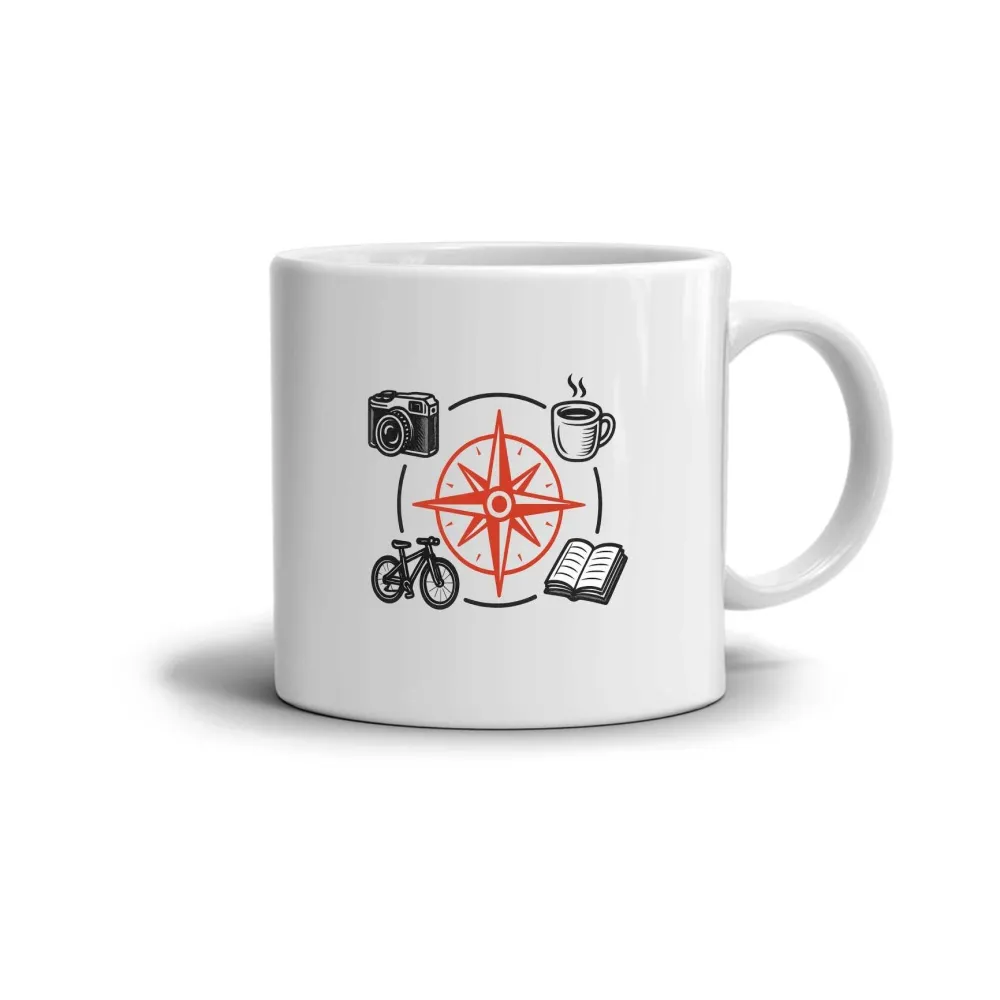 A bögre motívuma ötvözi a kalandvágyat, a pihenést és a felfedezés örömét. Középen egy iránytű ragyog, a szabadság és az irány jelképe, körülötte pedig kávé, fényképezőgép, kerékpár és könyv látható, amelyek együtt tökéletes kombinációt alkotnak mindazok számára, akik szeretik az utazást és a nyugodt pillanatokat. Ez a bögre inspirációt ad a világ és önmagunk felfedezéséhez.