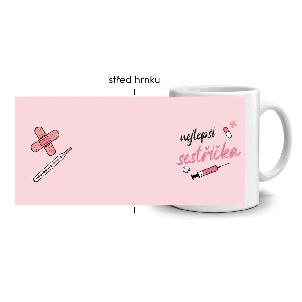 A halvány rózsaszín háttér apró orvosi motívumokkal kedves és harmonikus megjelenést kölcsönöz a bögrének. A minta barátságos és friss hatású, a gondoskodást és az odaadást jelképezi, amely a nővéri hivatást jellemzi. Az összhatás modern, ízléses és tiszteletteljes.
